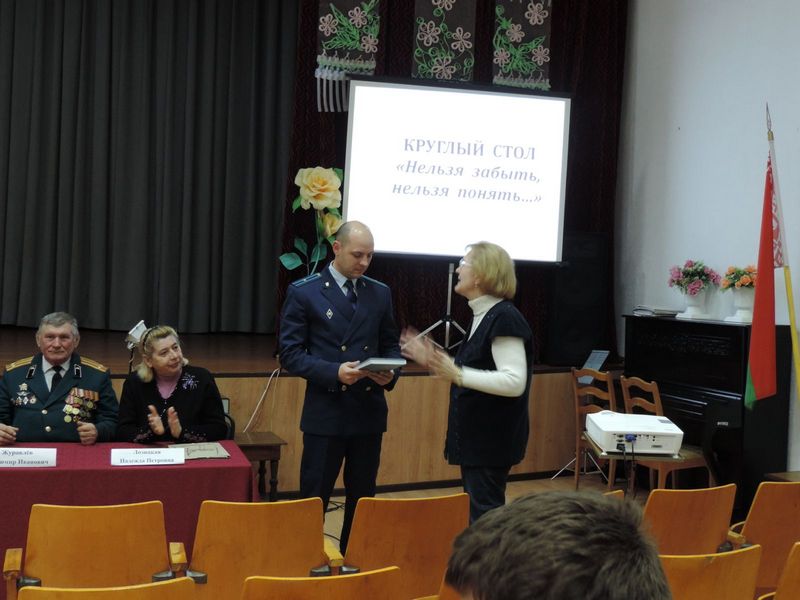 В актовом зале колледжа 9 декабря состоялся круглый стол при участии прокурора Лунинецкого района Прокопчука Ю.И., председателя районной организации «Белорусский союз офицеров» Журавлева В.И., председателя районного совета ветеранов Лозицкой Л.П., главного специалиста идеологической работы и по делам молодежи Лунинецкого РИК Молчана С.А., главного специалиста Лунинецкой РО ОО «БРСМ», журналиста, краеведа Конопацкой Т.В.